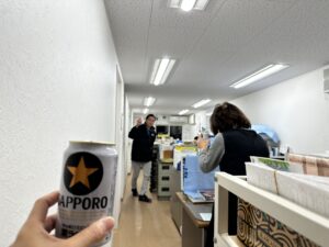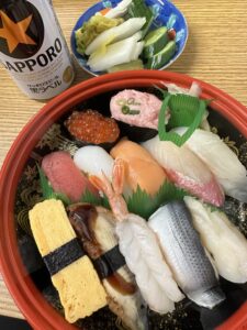 業務終了後、事務所でお寿司とビール、元旦ビューティーさんにいただいた元旦誉で1年の英気を養いました。